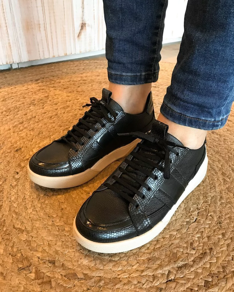 Zapatilla confeccionada en cuero natural color negro. Su forro es sintético premium negro. Sus cordones color negro y posee una base bicolor blanca y beige. Su horma súper cómoda, y sugerimos talle habitual.