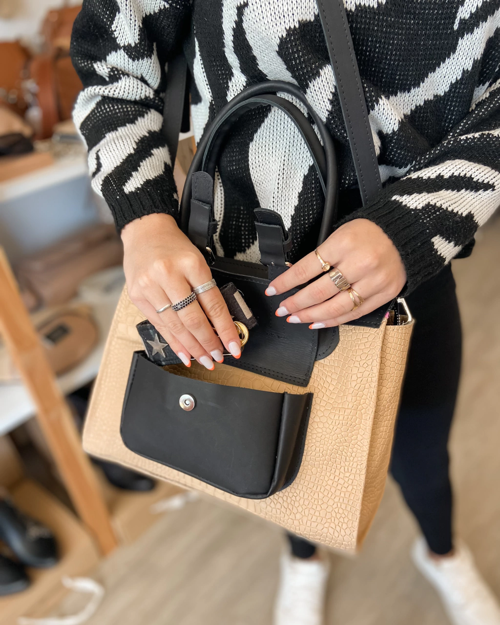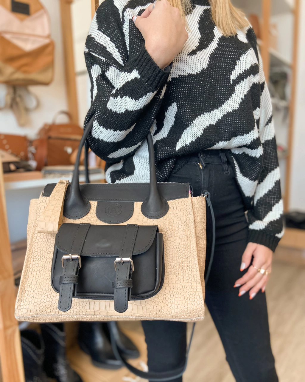 Cartera Antonia Agosti confeccionada de cuero. Posee manijas cortas y una correa larga, en su frente posee un bolsillo con pequeñas correas que le dan a la cartera un diseño distinguido.