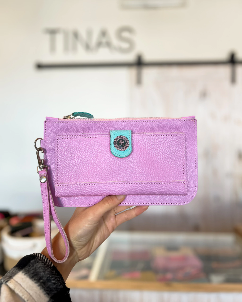 Billetera sobre confeccionada 100% en cuero, cuenta con una correa corta de mano. Su interior posee compartimentos para tarjetas y efectivo, bolsillo con cierre, bolsillo de guardado, doble cierre y más.