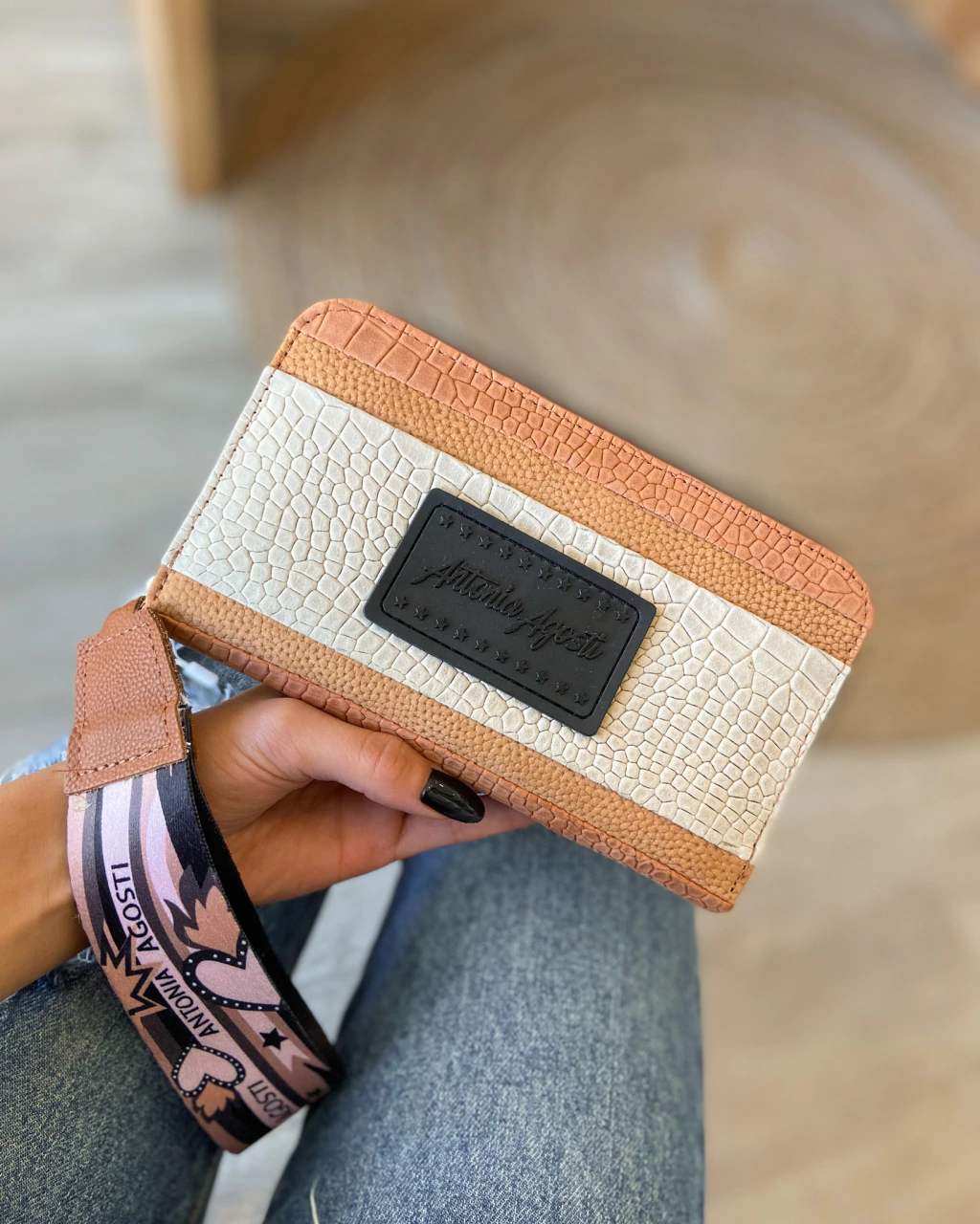 Billetera Antonia Agosti confeccionada en cuero con apertura de cierre metálico. En su interior tiene varios compartimentos para tarjeta y billetes, y un volante con ventana acrílica y varios