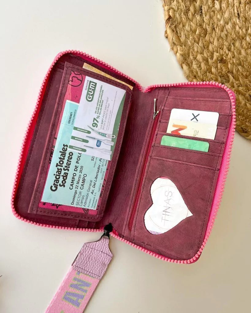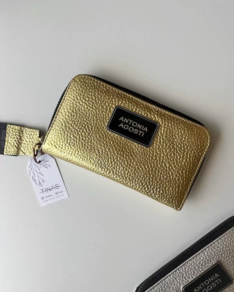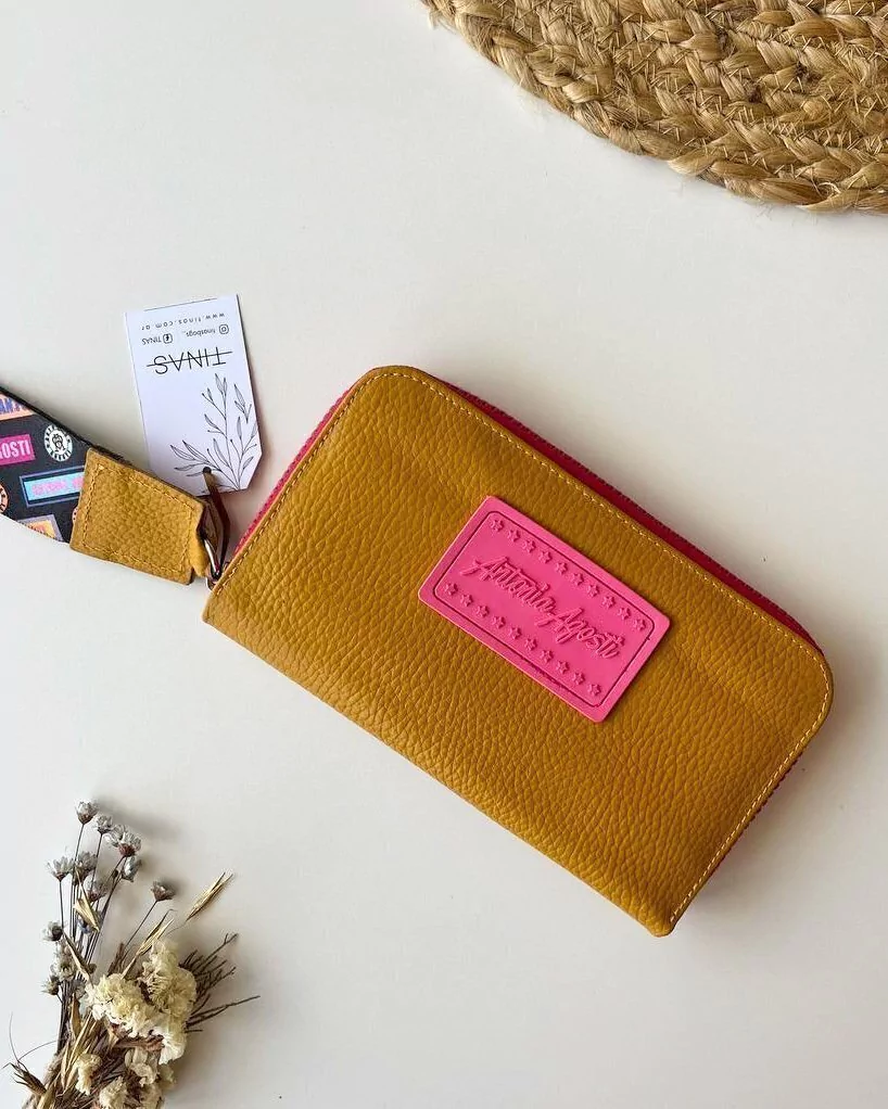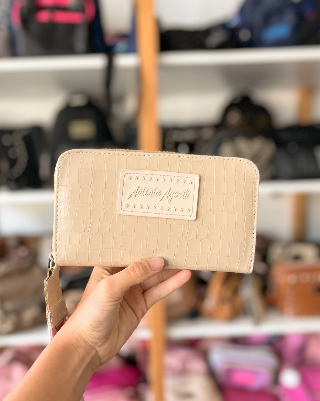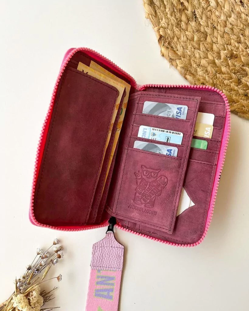 Billetera Antonia Agosti de cuero con apertura total de cierre diente de perro. Posee un interior forrado con tela personalizada y marca grabada en cuero, múltiples compartimentos para tarjetas y billetes. Tiene un volante interior con ventana acrílica y compartimentos para tarjetas y billetes; y también un bolsillo con cierre en espalda para monedas.