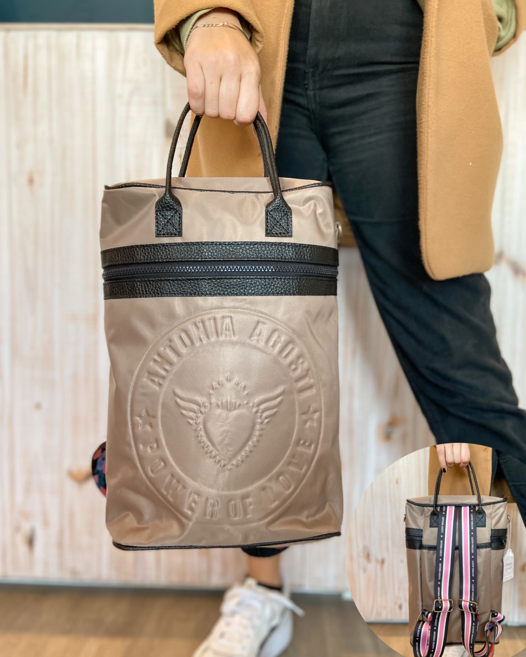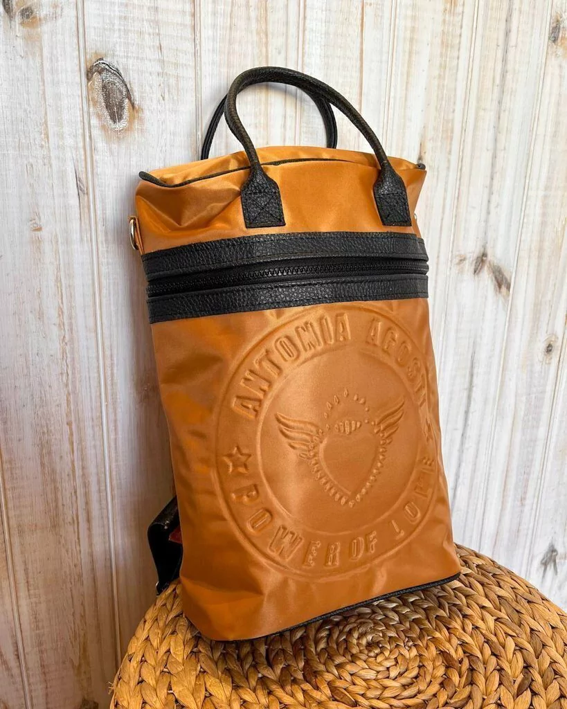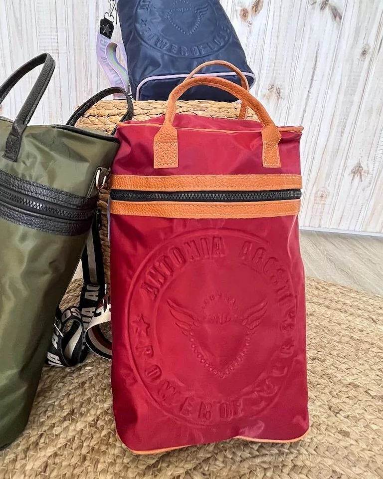 Posee una manija corta de mano de cuero y correa regulable en espalda, ideal para usar estilo mochi. A su vez tiene dos herraduras para agregarle una tercer correa y convertirlo en bolso!