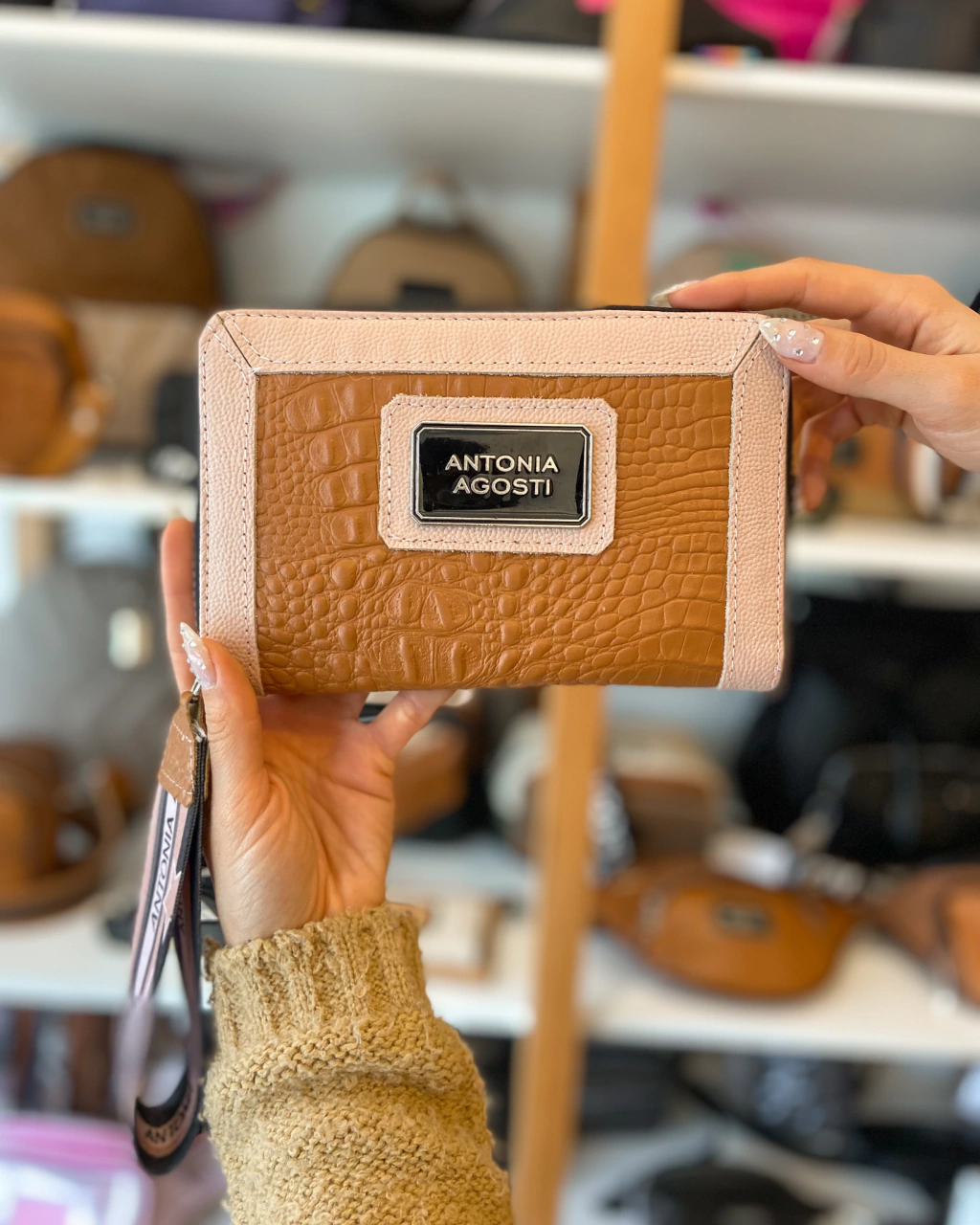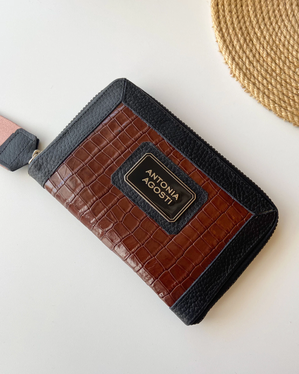 Billetera confeccionada en cuero Antonia Agosti. Su interior en cuero posee divisiones para tarjetas, compartimentos para billetes, un bolsillo con cierrre, y hasta un porta lapicera!.
