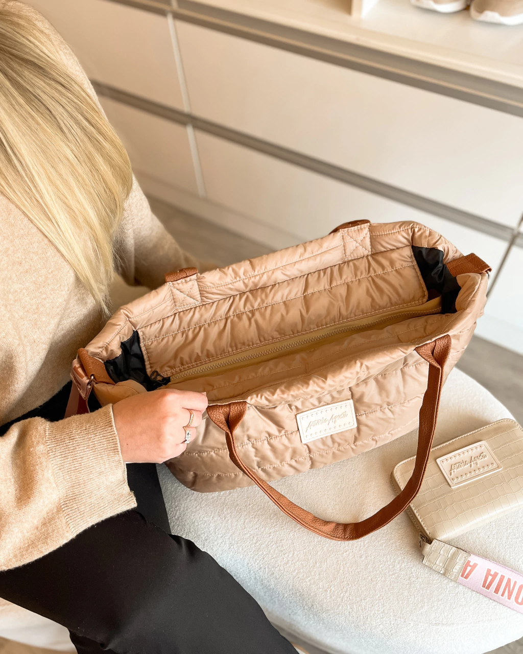 En su frente posee una medialuna para que puedas colgar tu llavero y una correa larga personalizada de Antonia Agosti regulable y con mosquetones.