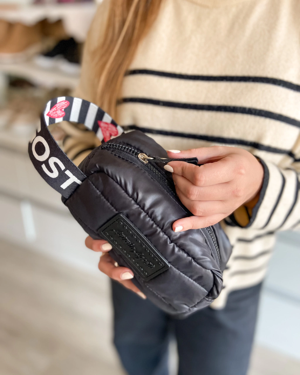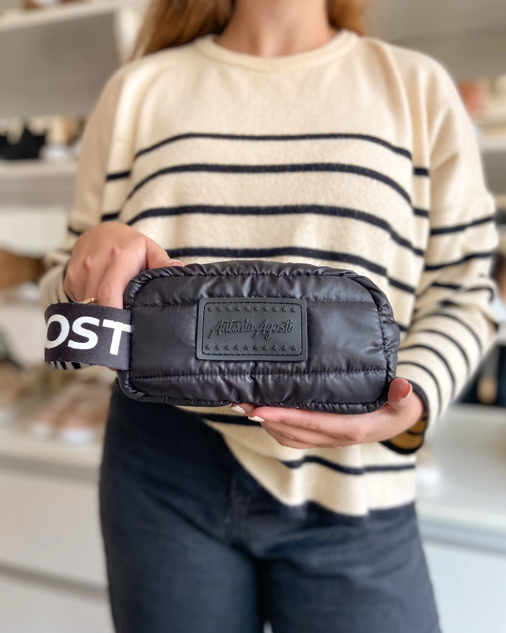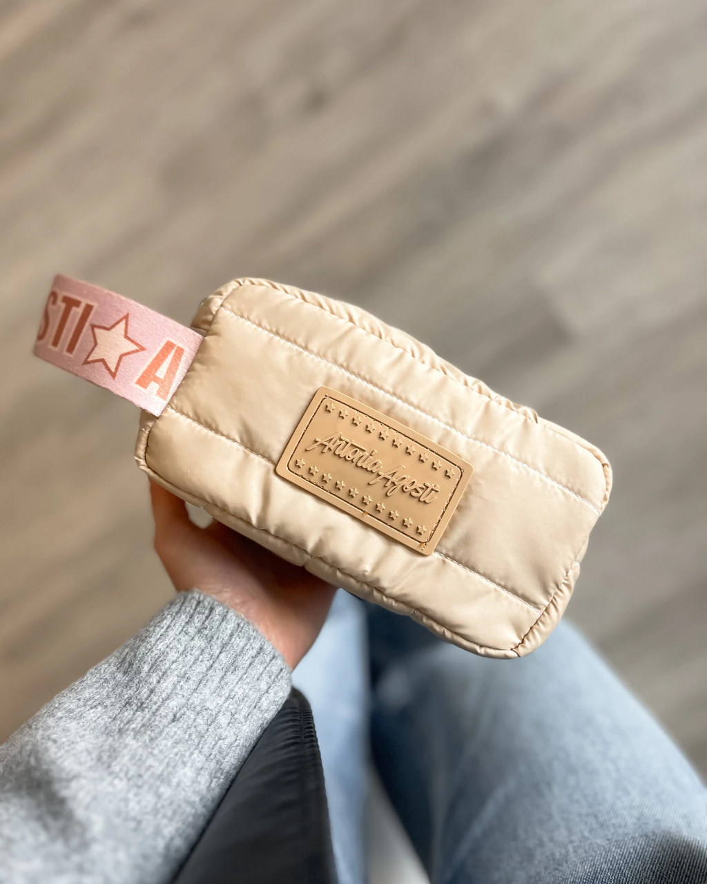 Porta cosmetico con acceso principial de cierre diente de perro. Cuenta con un pequeño compartimento en su interior. Personalizado con tela de la marca. Fabricado en sire con efecto puffer canelon, posee una correa en uno de sus costados para facilitar su movilidad.