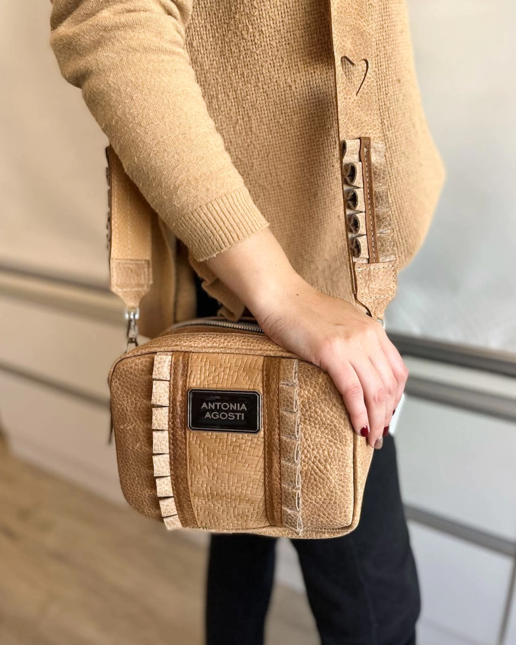 Bandolera Antonia Agosti de cuero con doble acceso con cierres metálico. Su interior esta forrado con tela personalizada de la marca, tiene tres bolsillos internos para guardar de todo de una forma más organizada!.