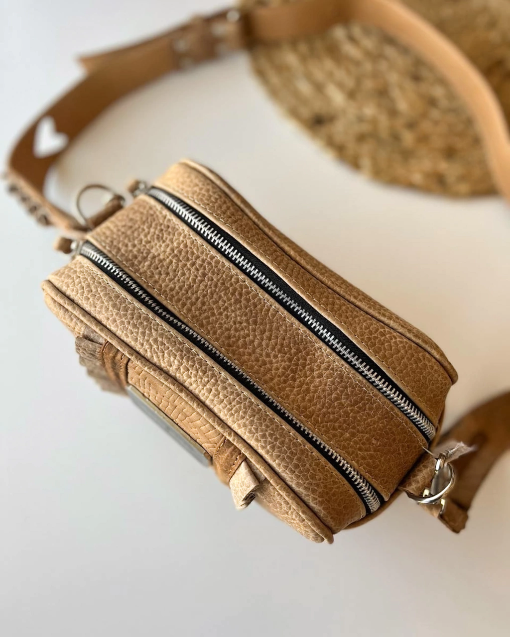 Su correa es de cuero regulable y desmontable con 2 mosquetones; y su frente esta trabajado con diferentes cueros y volados, lo que le da un toque súper especial.